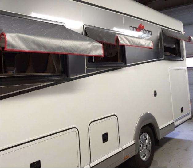 Det är grå tygvaxduk jag sytt av och rött kantband runt som passar in på husbilen. Tåliga och inga vassa kanter alls. Inget som förstörde rutorna heller om ni tänker det. Sydde triangel hörn och satte fönstret i det så satt dom kvar. Sen kom maken på hur vi skulle fästa dom. Lagarbete 🙂